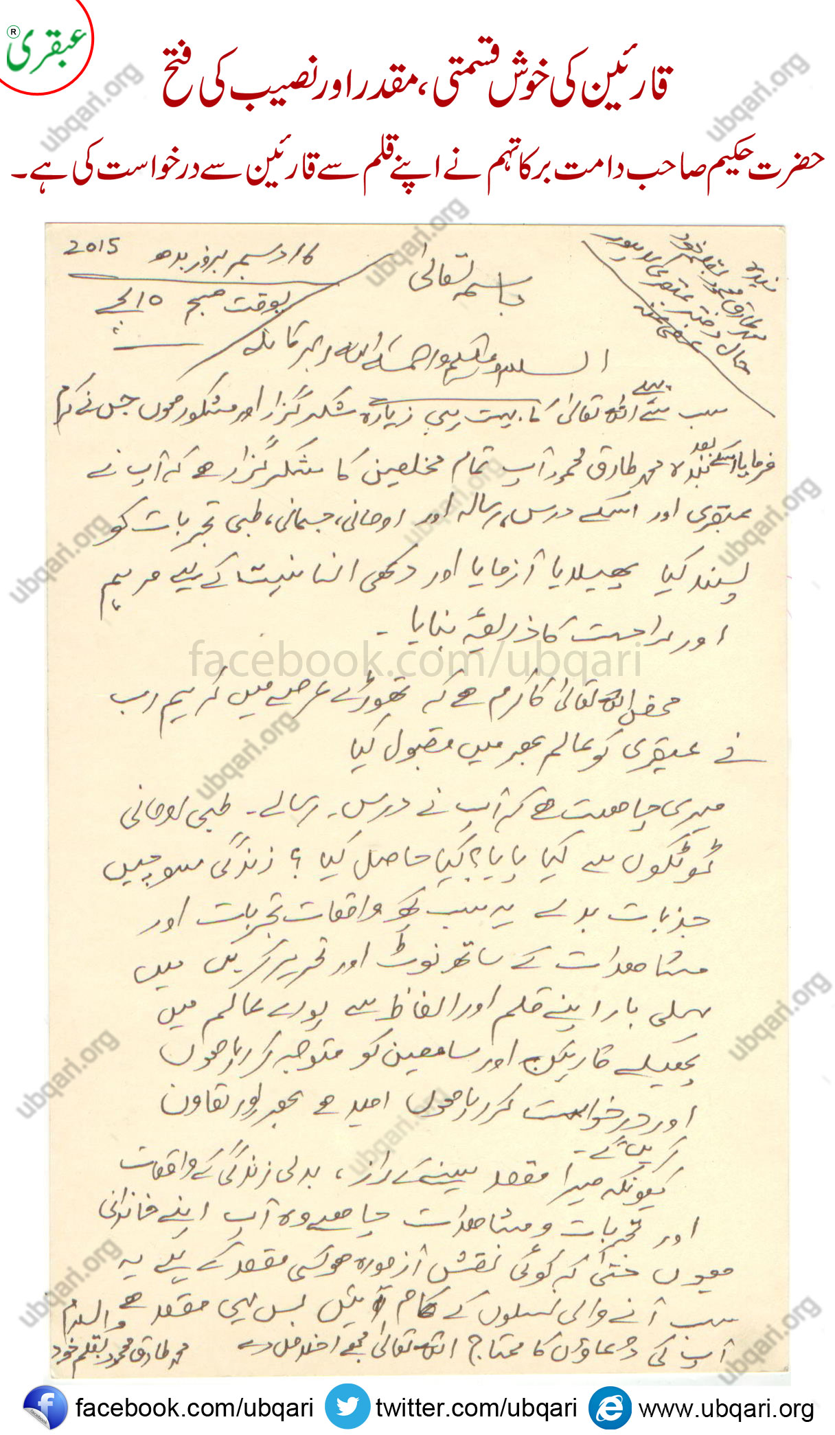 حضرت حکیم صاحب ان کی نسلوں عبقری اور تمام نظام کی مدد حفاظت کا تصور کر کےحم لاینصرون ہزاروں پڑھیں غفلت نہ کریں اور پیغام کو آگے پھیلائیں۔