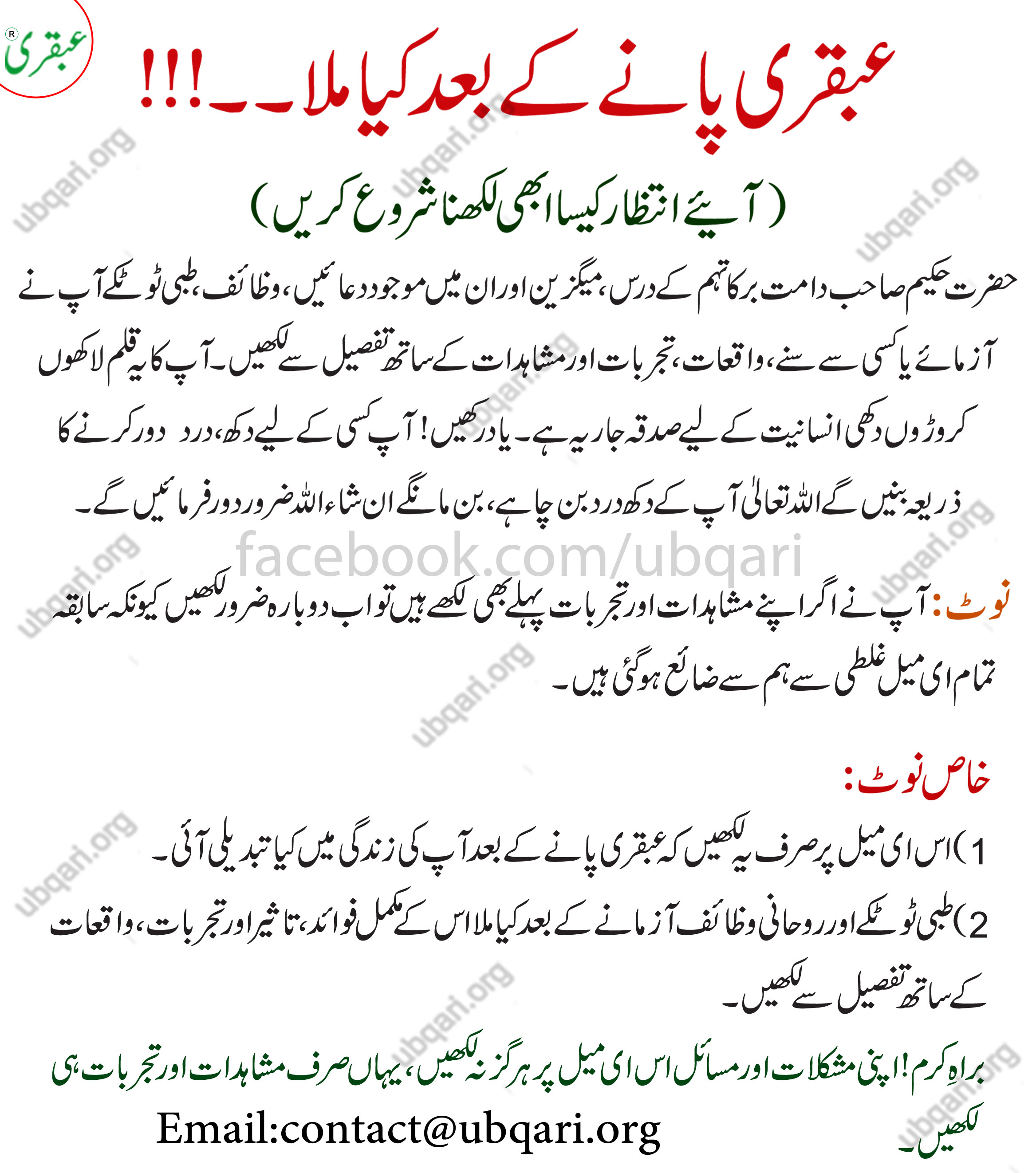 1) اس ای میل پرصرف یہ لکھیں کہ عبقری پانے کے بعد آپ کی زندگی میں کیا تبدیلی آئی۔