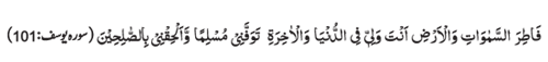 ترجمہ : اے آسمانو ں اور زمینو ں کے پیدا کرنے والے دنیا اور آخرت میںتو ہی میرا رفیق ہے ، تو مجھ کو اپنی فرمانبرداری میں دنیا سے اٹھا لے اور مجھ کو اپنے نیک بندو ں میں داخل کر لے۔